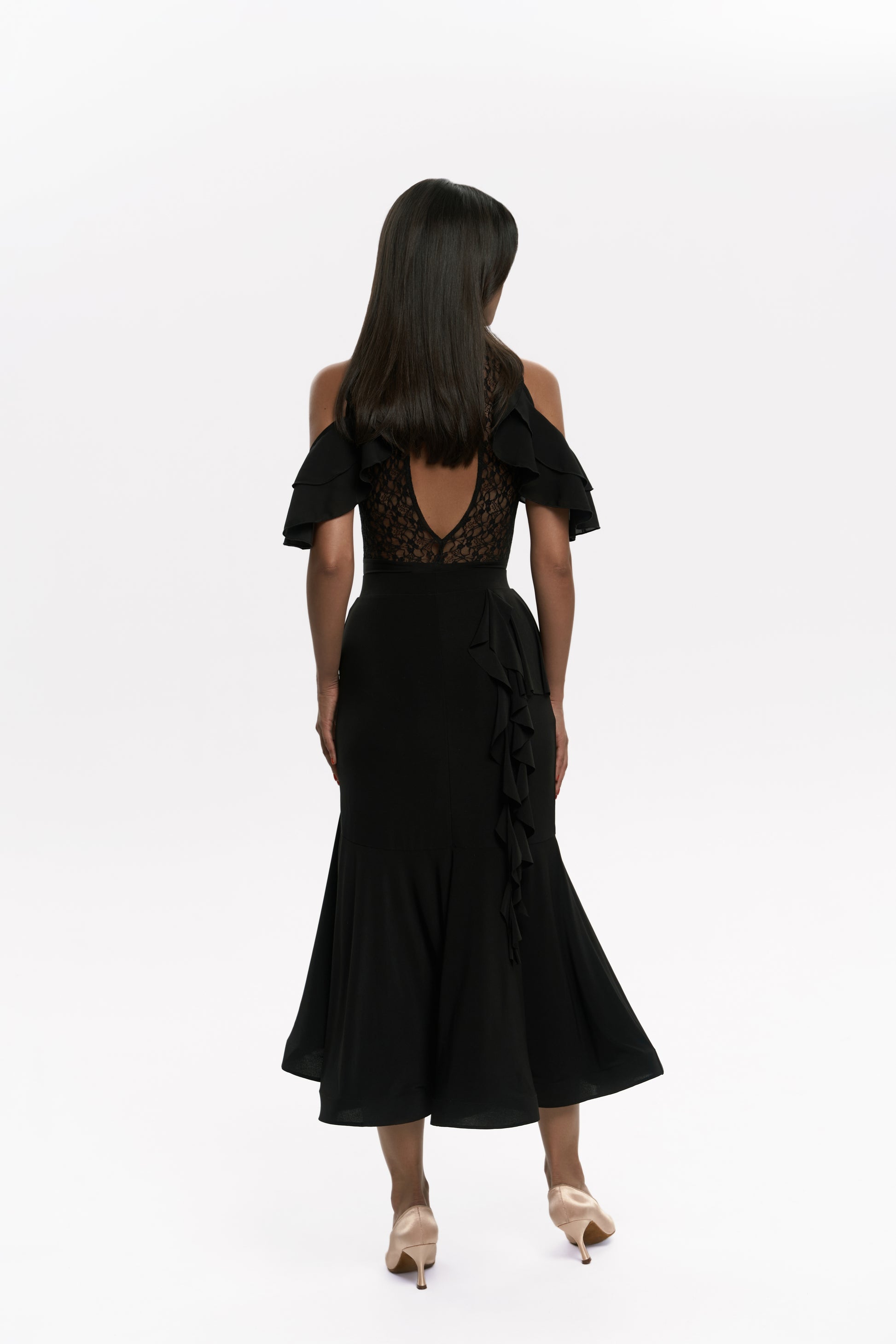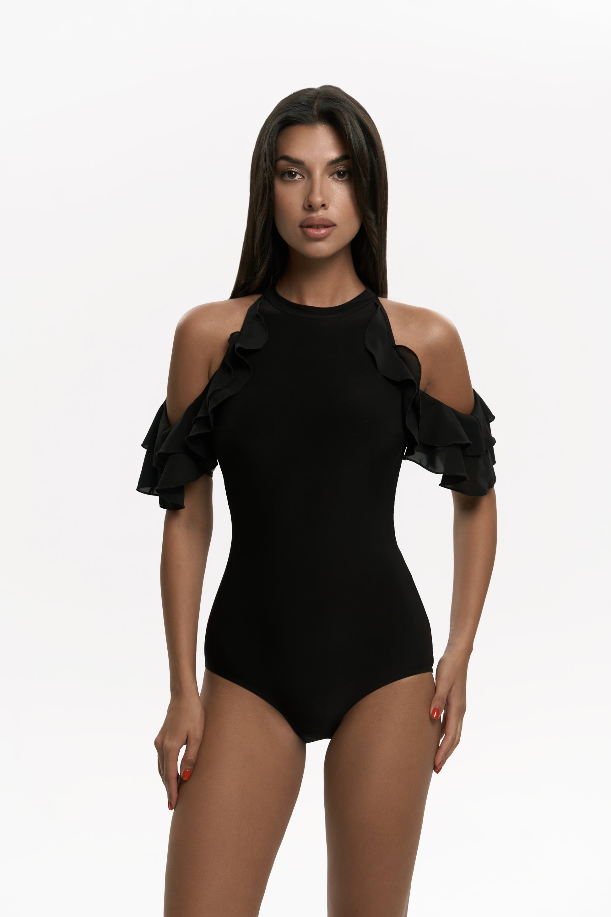 Body Polly: Geraffte Schultern verleihen verspieltes Volumen, während der Spitzenrücken einen Hauch von Geheimnis hinzufügt.