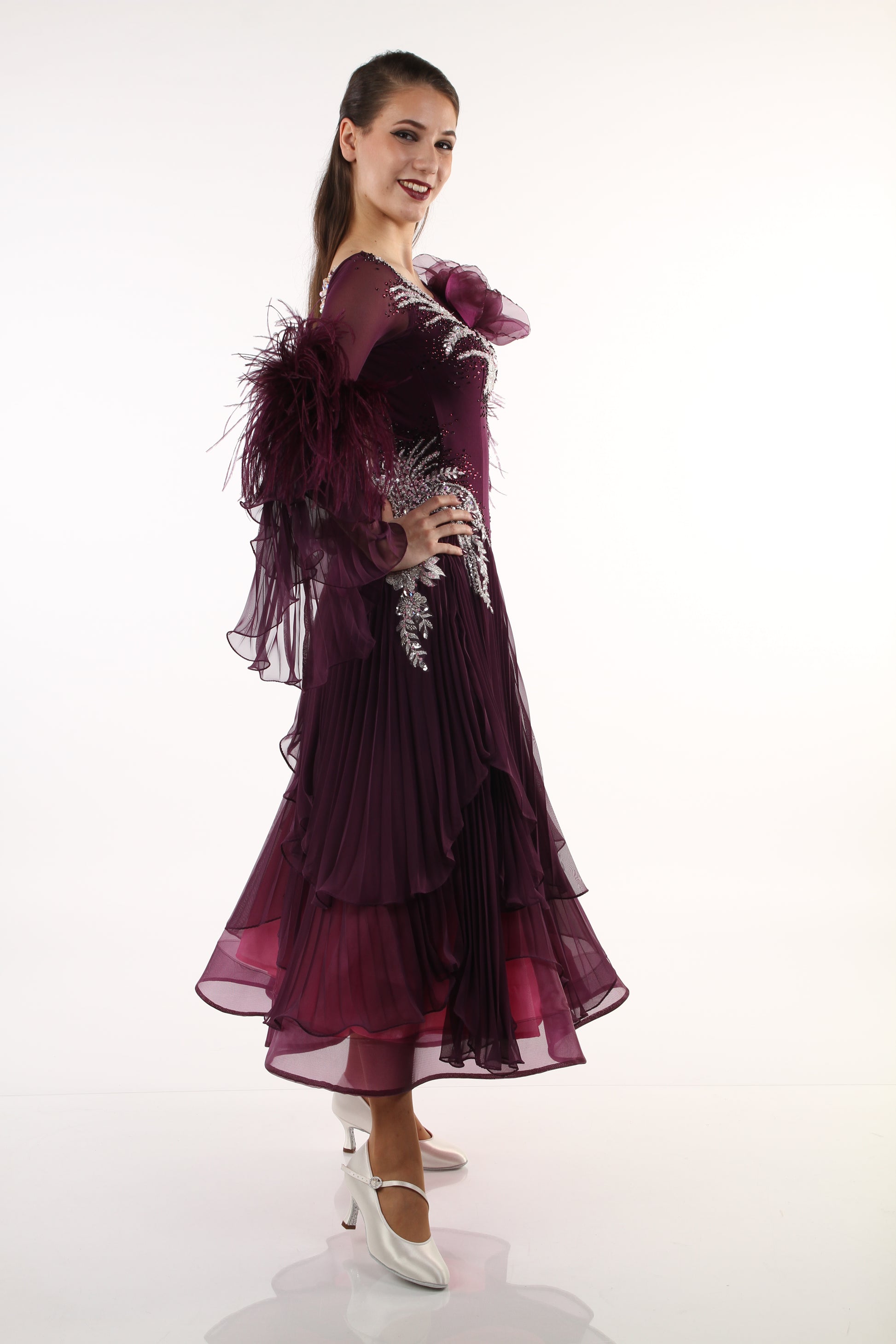 Fliege traumhaft leicht mit plissierten Röcken und Glitzeerketten zum Turnier-Erfolg. Die wunderschöne Beerenfarbe und die hellen Strassapplikationen werden dich besonders strahlen lassen.