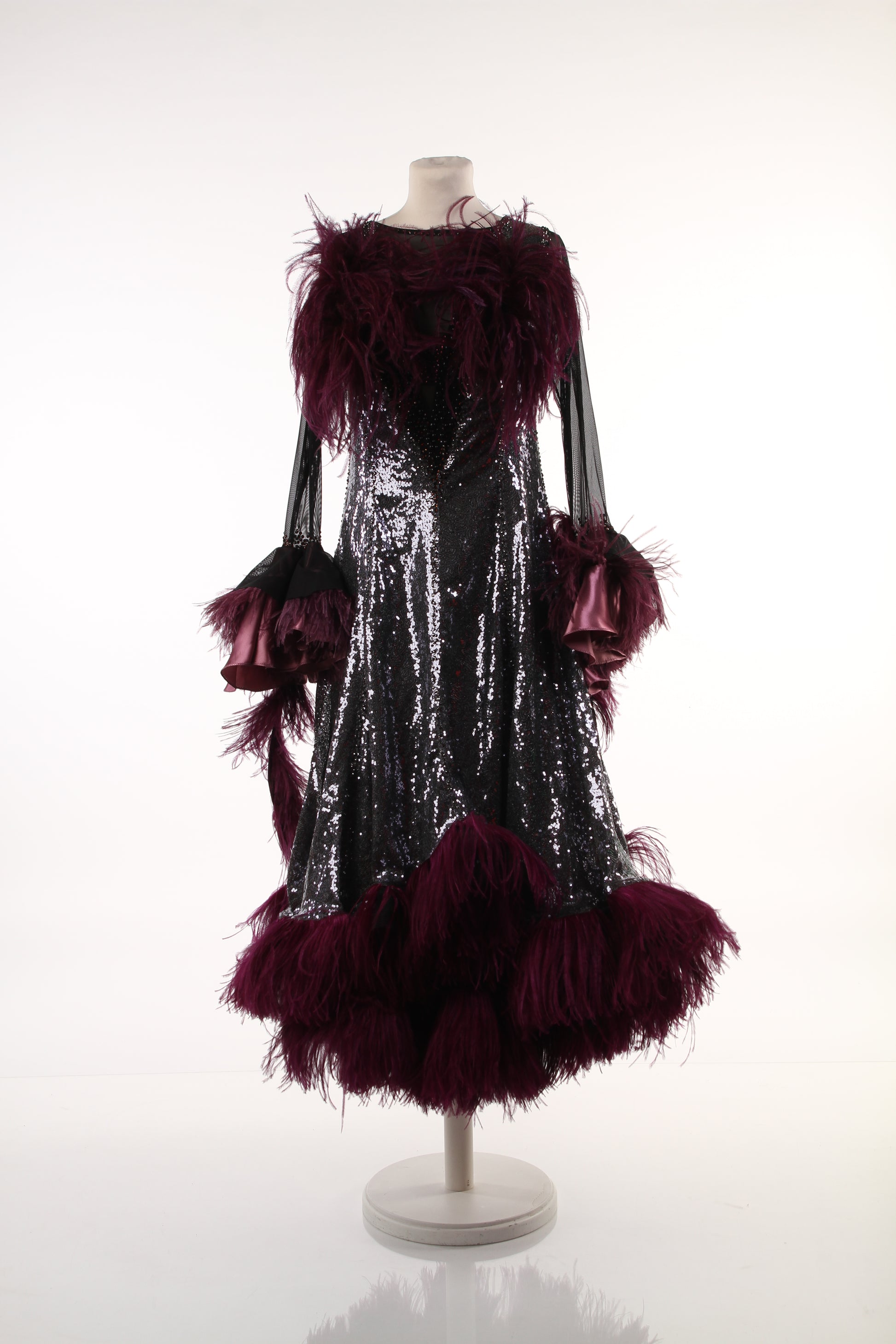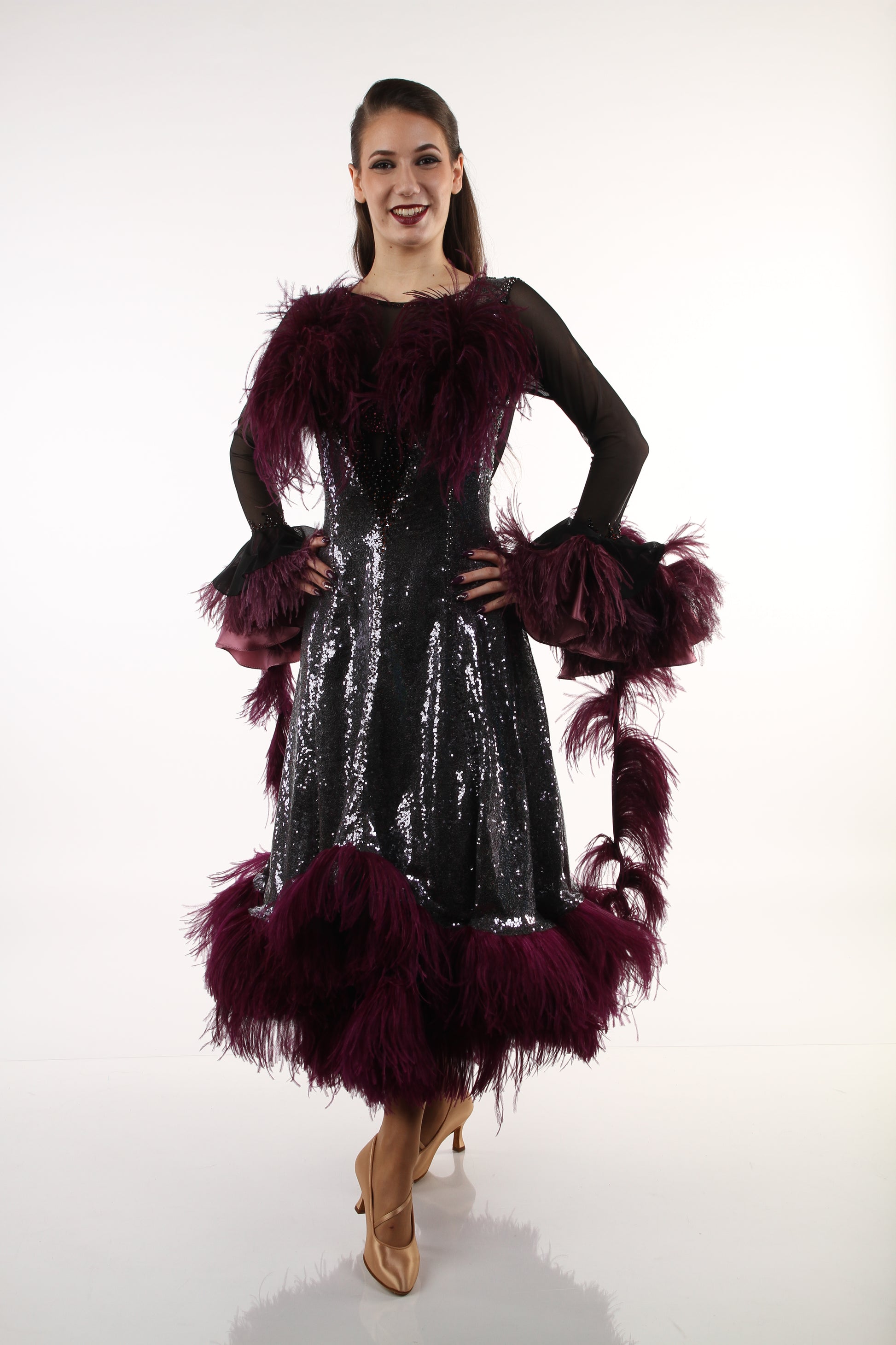 Mit diesem Traumkleid erscheinst du mystisch und elegant zugleich. Der stretchige Paillettenstoff hat eine besonders gute Wirkung auf der Tanzfläche. Die leichten Federn in der Farbe Plum bilden wunderschöne Highlights für eine vergrößernde Oberlinie, so kannst Du erfolgreich und mit Freude Turniere tanzen.