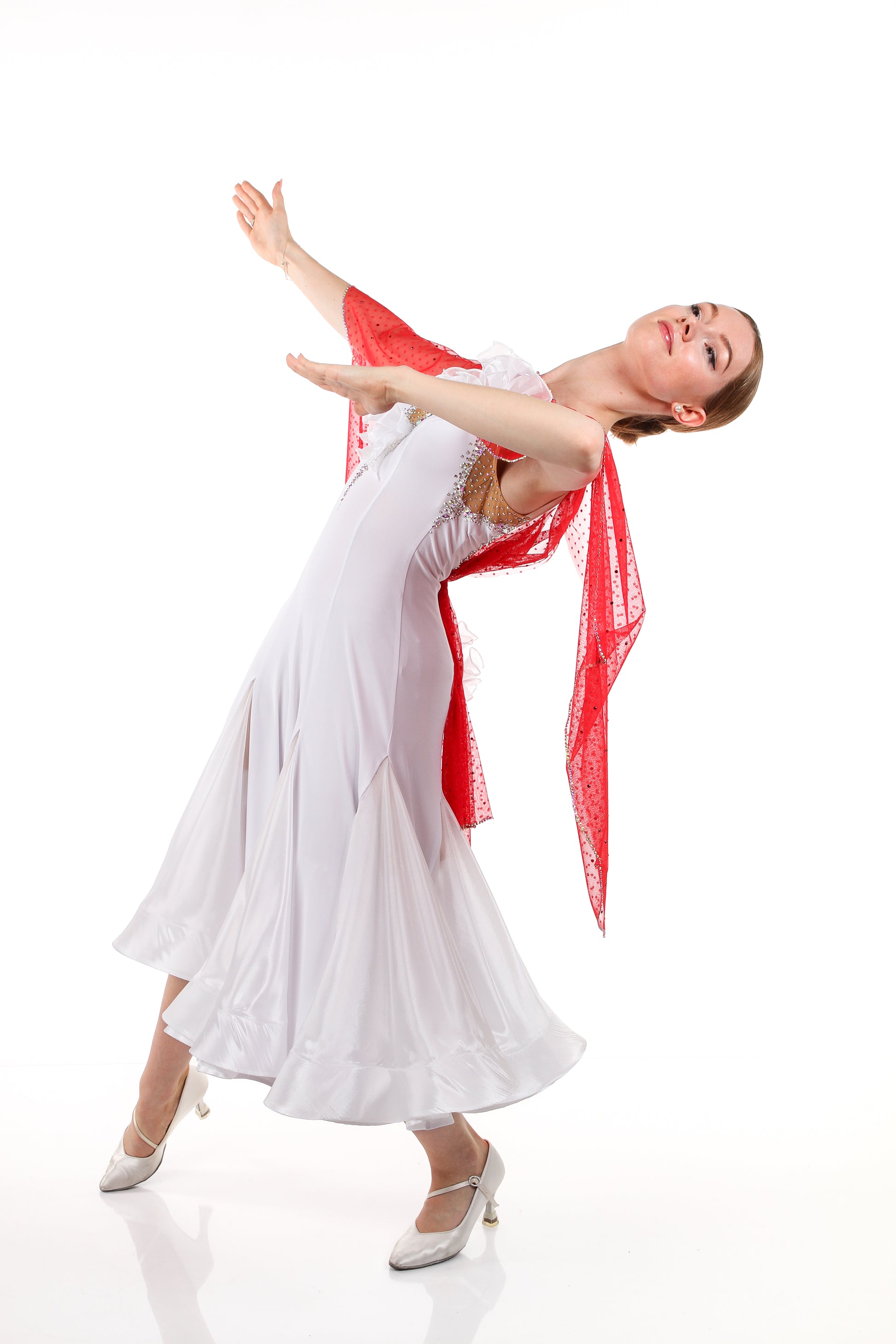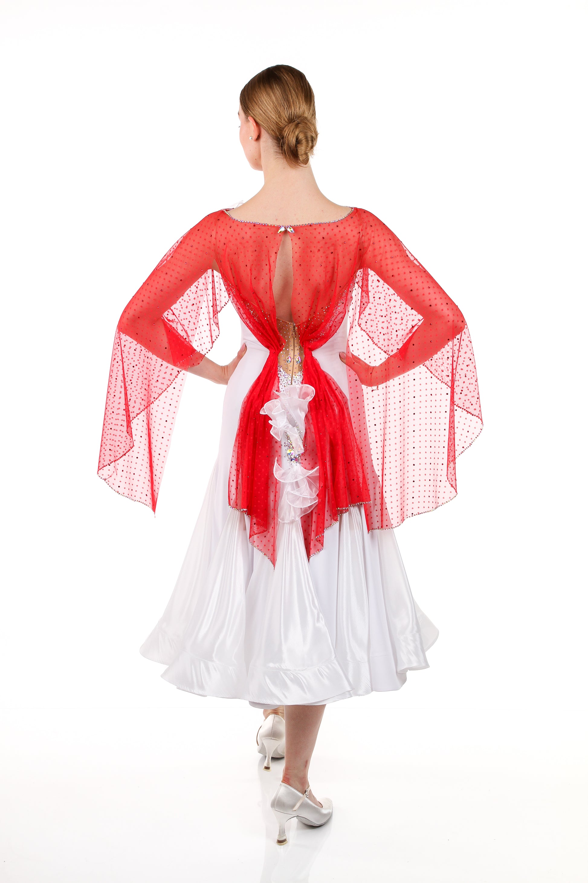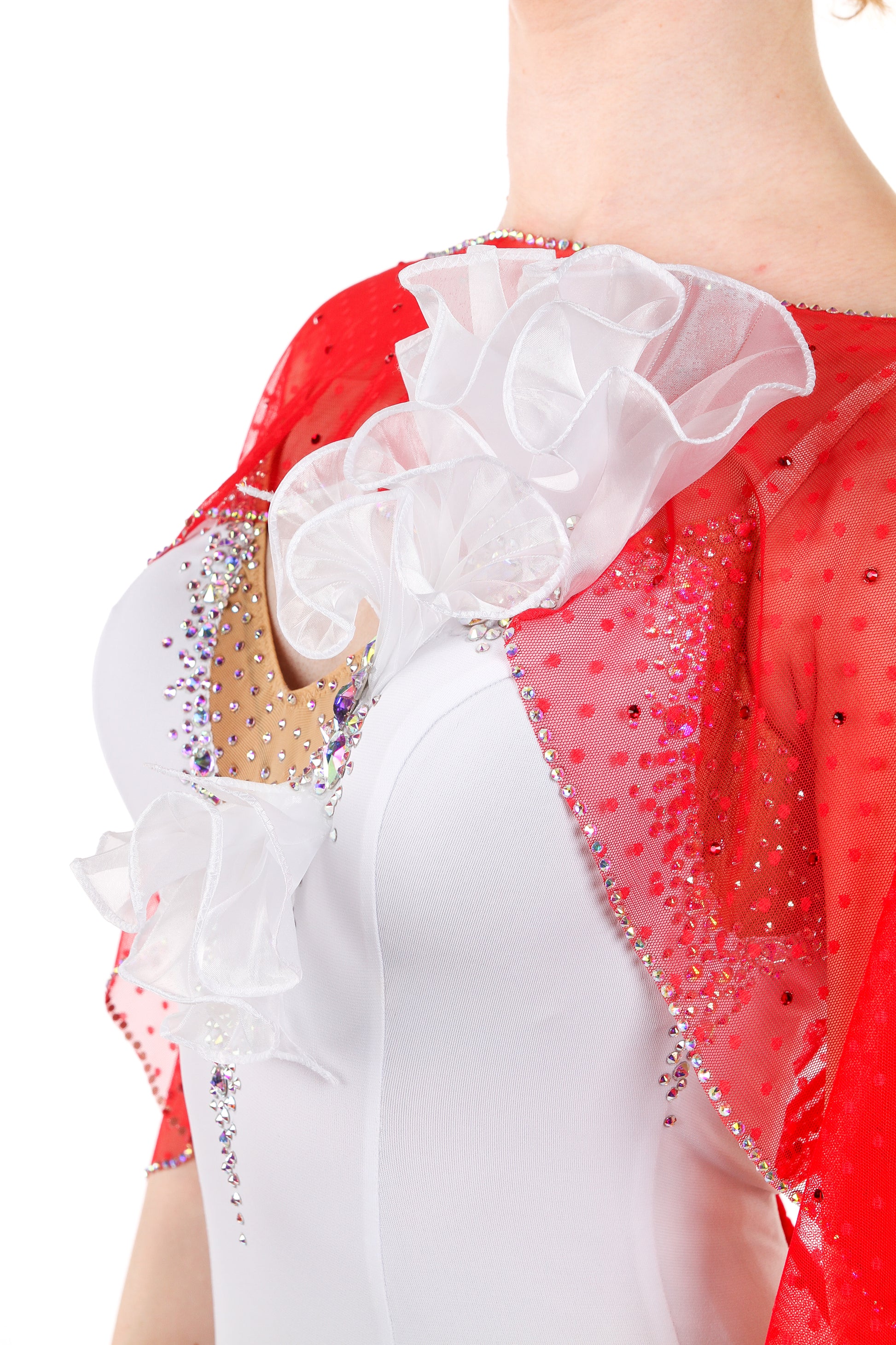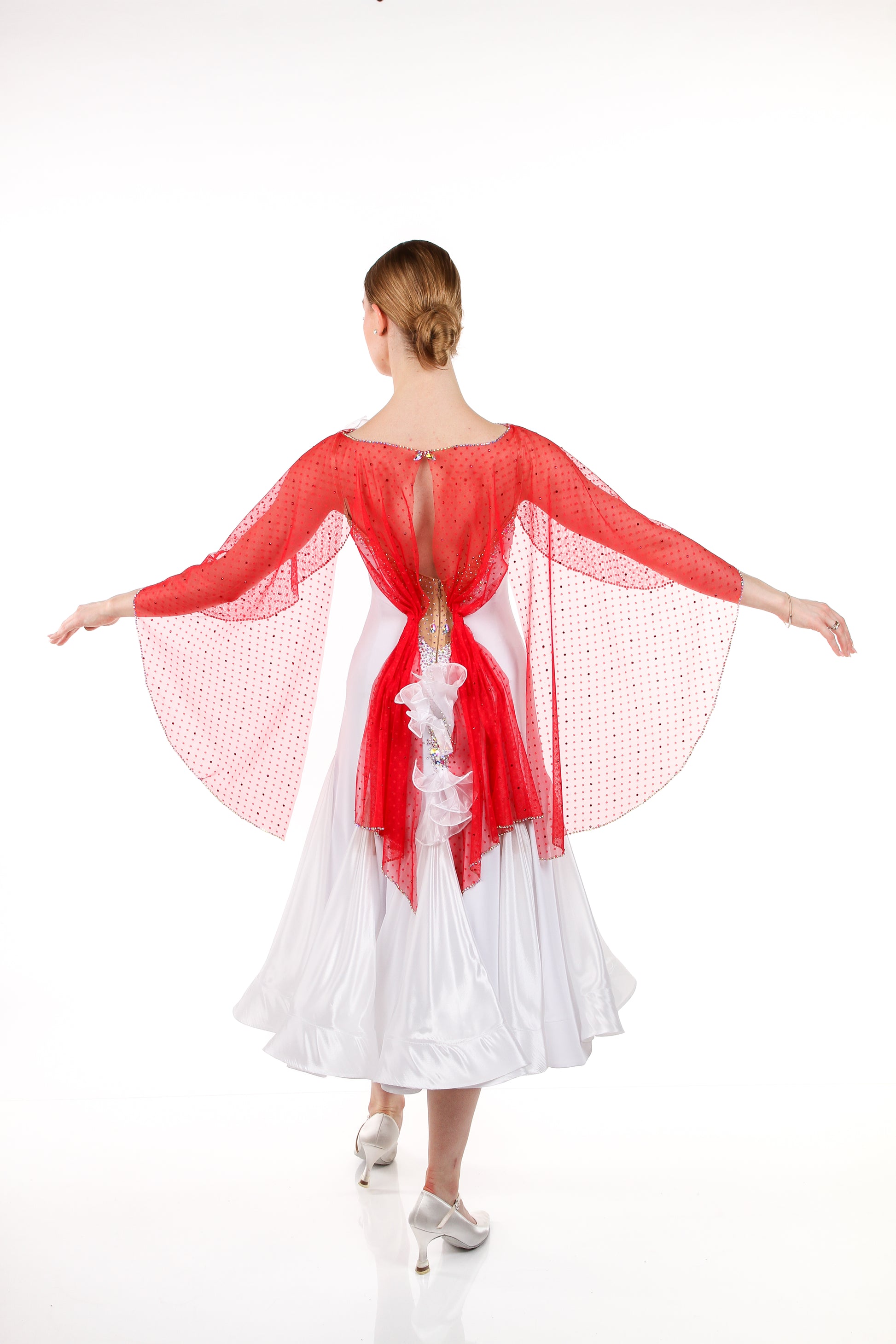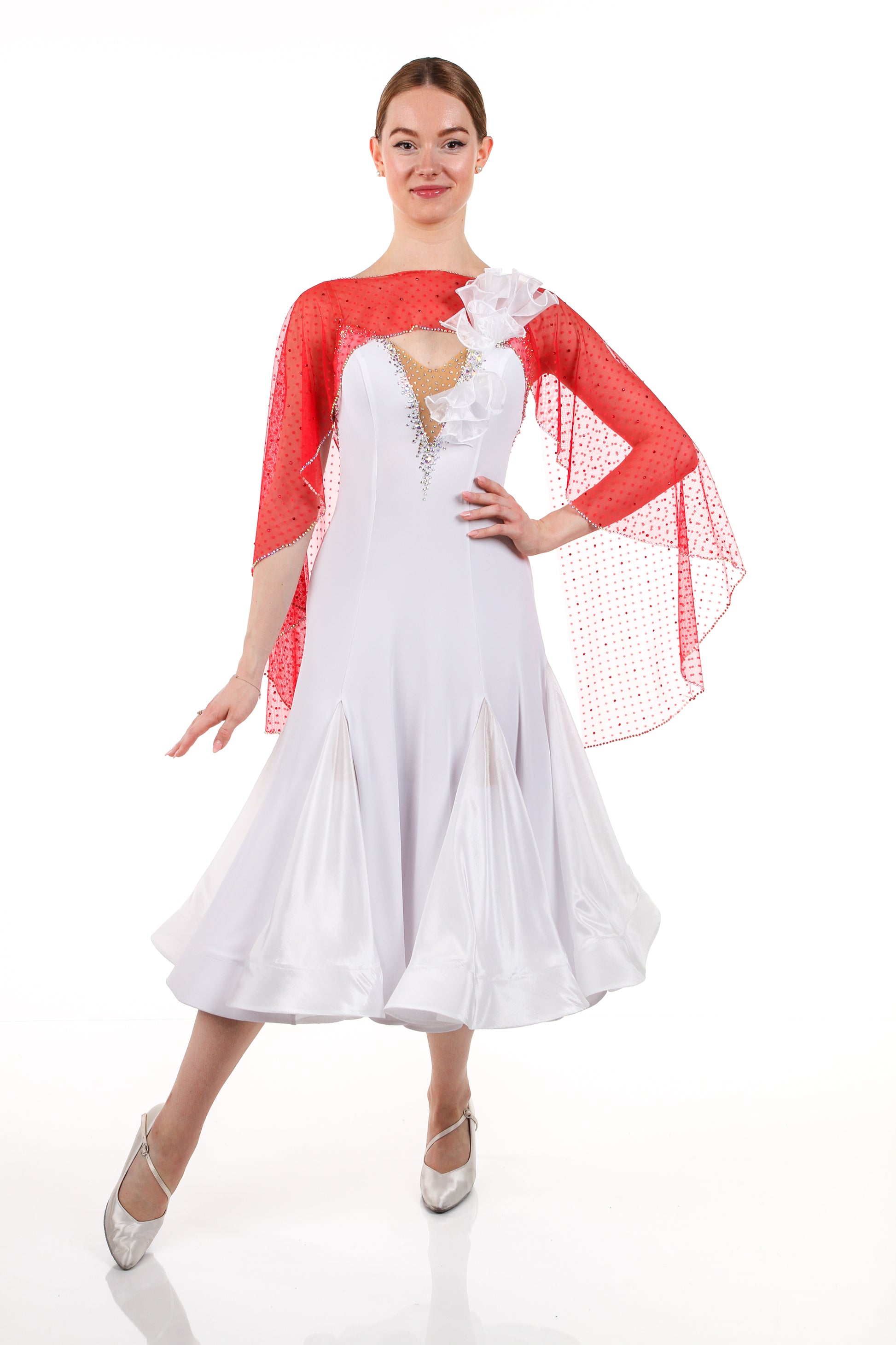 Zartes und minimalistisches Tanzkleid für Standarttanz. Mache Dich sichtbar mit diesem sanften Farbkontrast und der lässigen Leichtigkeit von weissem Stoff gepaart mit rotem Tupfentüll.